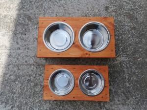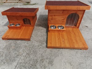 Masszív fából készült tartó amelyben az itató és az etető tál is elfér, két fajta méretben készítjük a kisebb és közepes kutyusoknak 2 db 16cm átmérőjű és 7 cm mély, egyenként 0,75 literes tállakkal szereltük fel a tartót, a nagyobb kutyusoknak pedig 2 db 21 cm átmérőjű és 7cm mély, egyenként 1,7 literes tálakkal szereltük fel. A mellékelt tálak minden esetben rozsdamentes fémből vannak. A tartók kialakításának köszönhetően, szükség esetén rögzíthetők a kutyaház oldalához vagy elejéhez, és így a kutyusok nem tudják azt feldönteni vagy bepiszkítani. Csak ajánlani tudom.